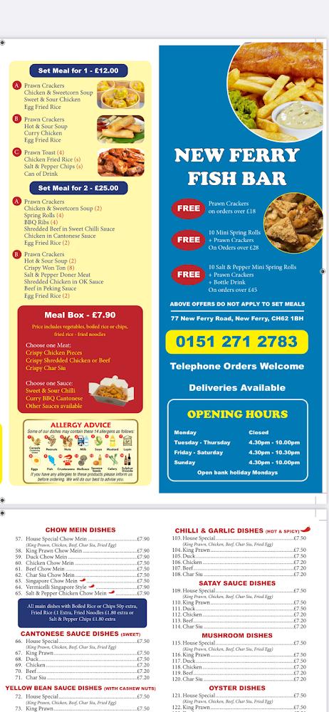 New Ferry Fish Bar is a local gem nestled in the heart of Birkenhead, specifically at 77 New Ferry Rd. This bustling area is known for its vibrant community and diverse culinary scene, with the fish bar emerging as a favorite among residents and visitors alike. The establishment has built a reputation for its authentic Chinese meals and traditional fish and chips, making it a reliable option for those seeking comfort food.